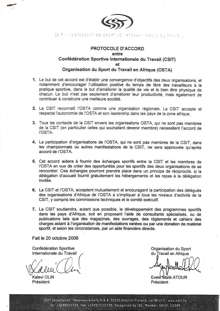 The role of the OSTA is to promote, organize, develop, coordinate, control and direct the practice of physical and sports activities in the workplace in Africa and to participate in activities organized, recognized and / or sponsored by the CSIT, its Members and its partners, as well as those of the organizations to which it has joined or is affiliated.