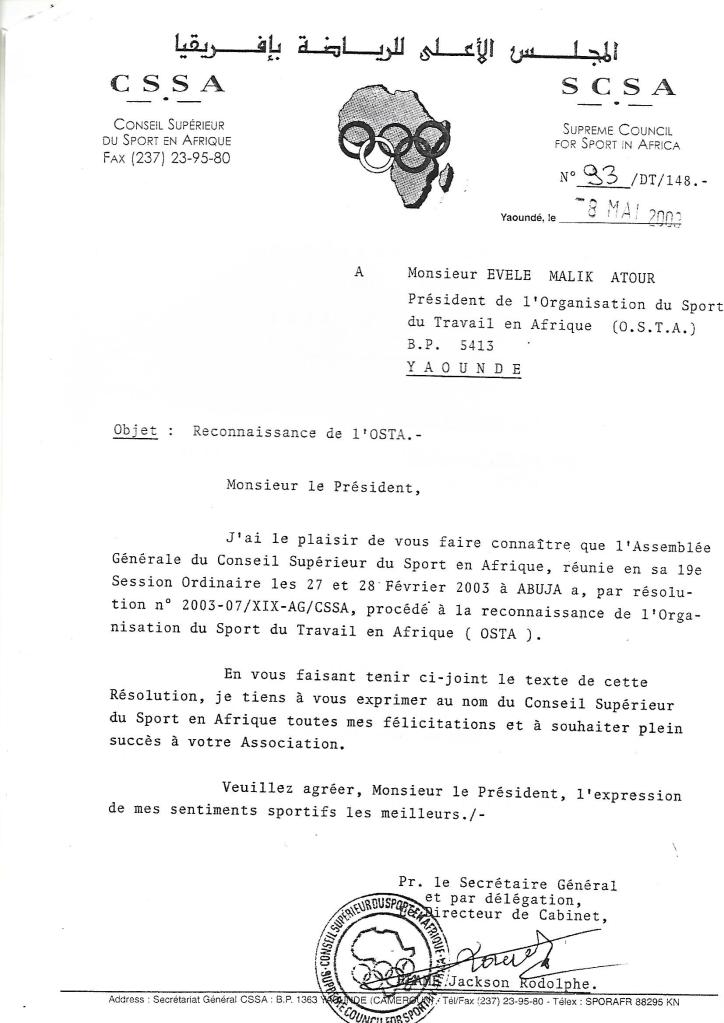 The OSTA is recognized by the African Union (AU) and the Association of National Olympic Committees of Africa (ANOCA). She is a Member of the International Workers and Amateur Sports Confederation (CSIT) and of the Union of African Sports Confederations (UCSA).